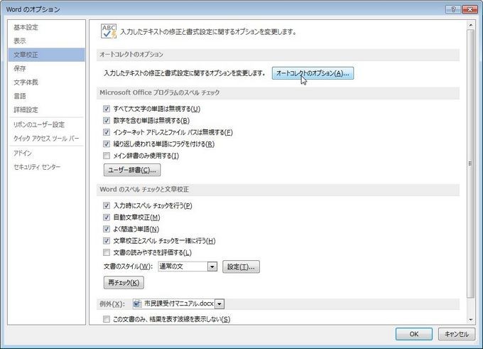 「文章校正」の「オートコレクトのオプション」から必要な項目を設定する