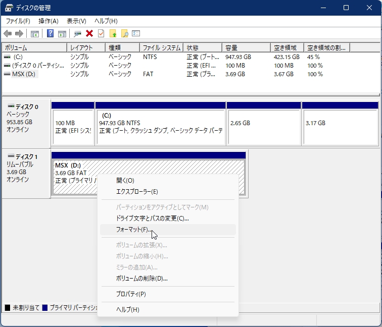 以上でFAT16でフォーマットをすることができます。