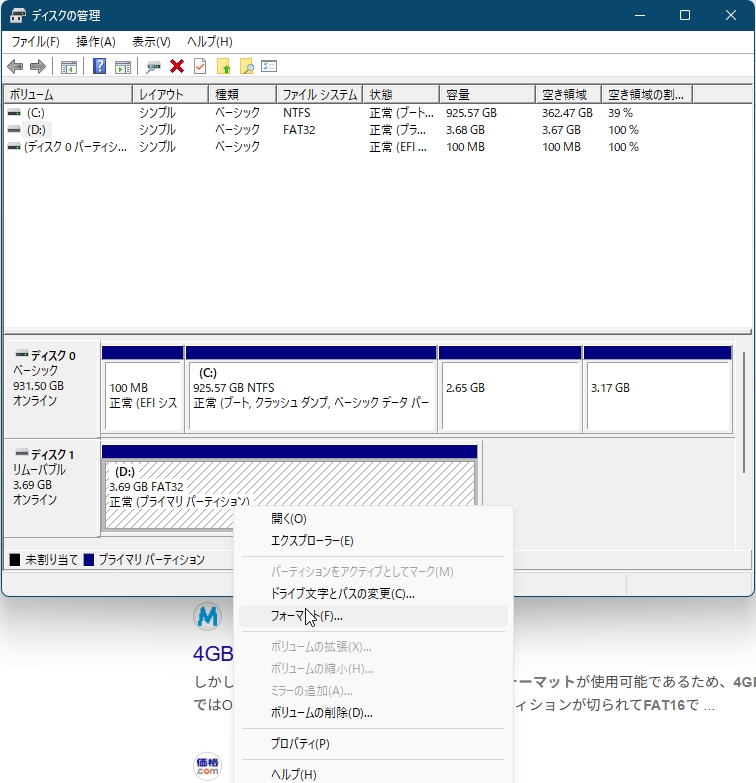 ディスクの管理が表示されたらFAT16でフォーマットするSDカードのパーティション部分を右クリックする