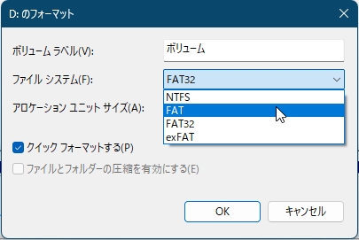 表示されたダイアログのファイルシステムでFATを選択してOKボタンを押す