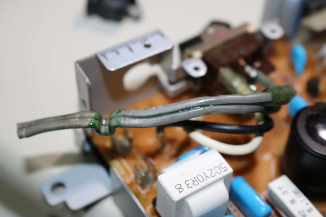 ▼写真のようにケーブルのみを引き出せたら、同様の太さのAC100Vコンセントプラグのついたケーブルをはんだ付けして熱収縮チューブでカバーして元の通りに戻せば電源ケーブル修理完了です。