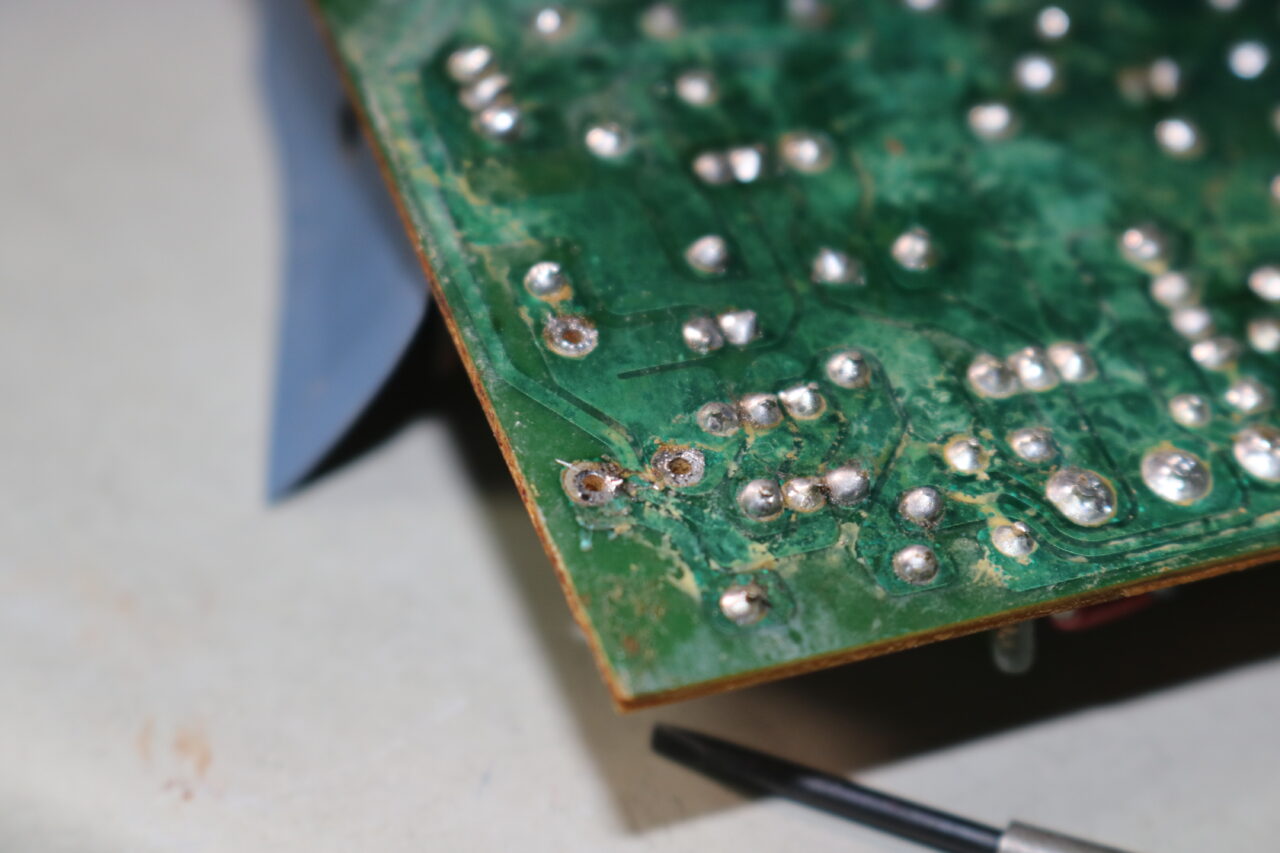 コンデンサの取り外しは量があるので、はんだ吸い取り機*1があればベストですが、値段が高いので、はんだ吸い取り線を使ってきれいにはんだを取り除いて取り外しておくと交換がスムーズです。