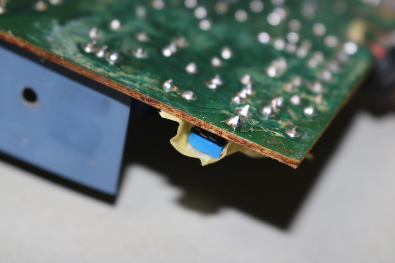 面倒くさかったら問答無用で写真に写っている4個をとりあえず交換してしまっても構いません。本来はきれいにはんだ付けするためにすべての部品を外してメイン基板を取り出し、部品を取り除いた後に新しいコンデンサを付けなおすのがベストですが、時間がなくて、仕上がりの美しさが特に気にならない方は、上記の写真のように、もともと付いていたコンデンサの足をできるだけ高いところでニッパーでカットしてその足に新しいコンデンサを付けるという時短技が使えます。めちゃ早いです( ´∀` )