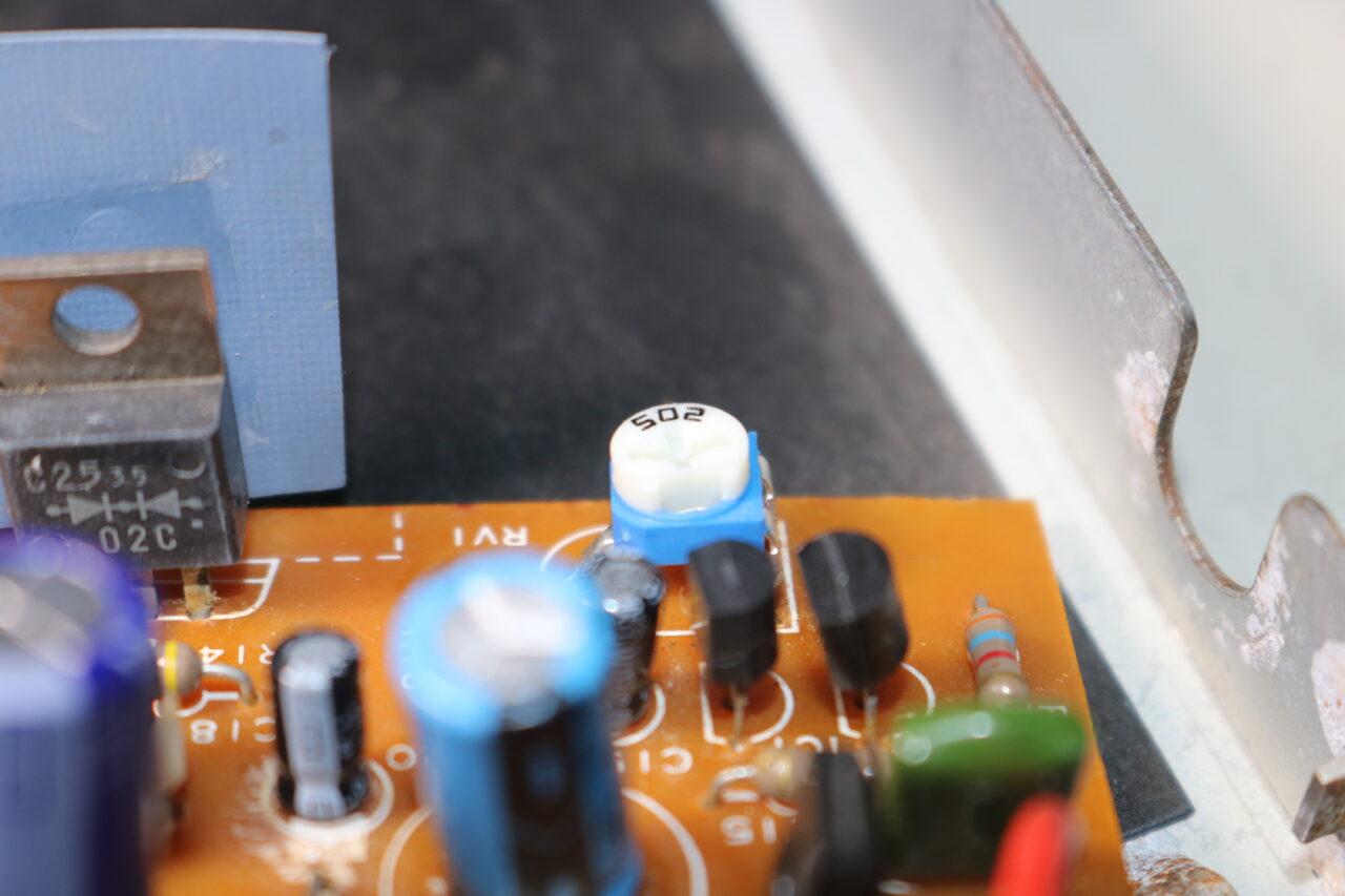 この部品の抵抗値調整部分をマイナスドライバーを使って回すと出力電圧が変化します。もともとついていた半固定抵抗器を回すだけで直ってしまう場合も多いですが、ここは後々のことを考えて新品と交換します。