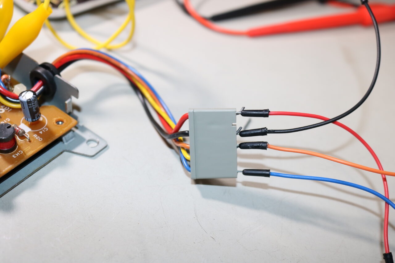▼電源が出力されるように、黄(コントロール)、黒(GND)の基板から出ているラインをミノムシクリップでショートします。