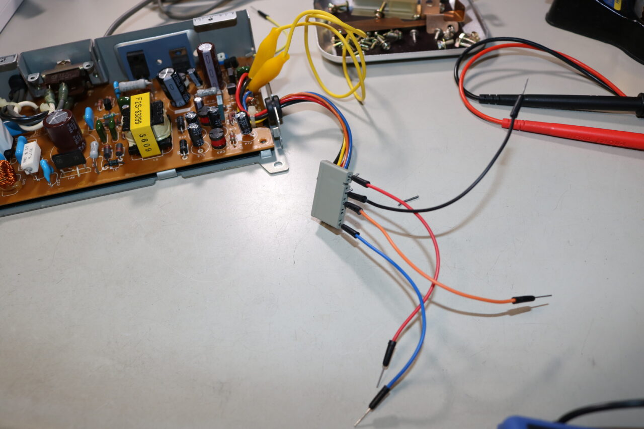 ▼こんな感じで適当な太さのはんだ線とブレッドボード用のワイヤーで測定用の電源出力を取り出します。