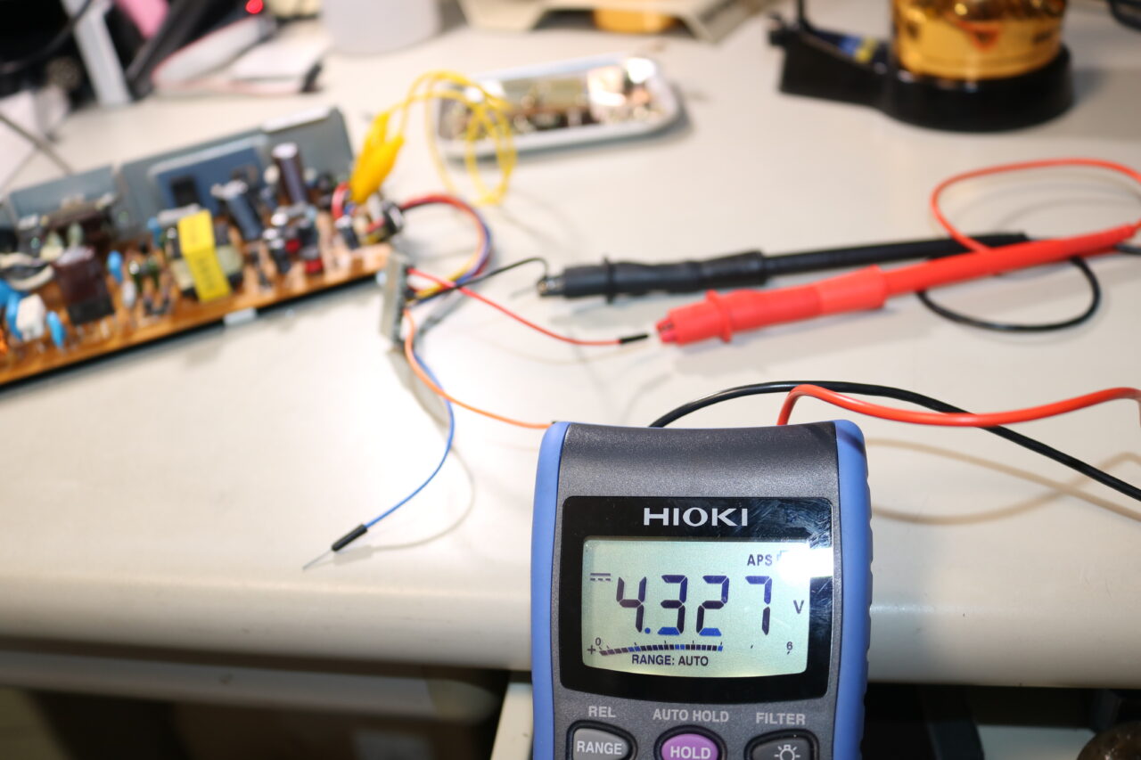▼経年劣化してくるとこのように電圧が下がります。赤(+5V)と黒(GND)を試しに測定してみると4.3V程度しか出力されていません。