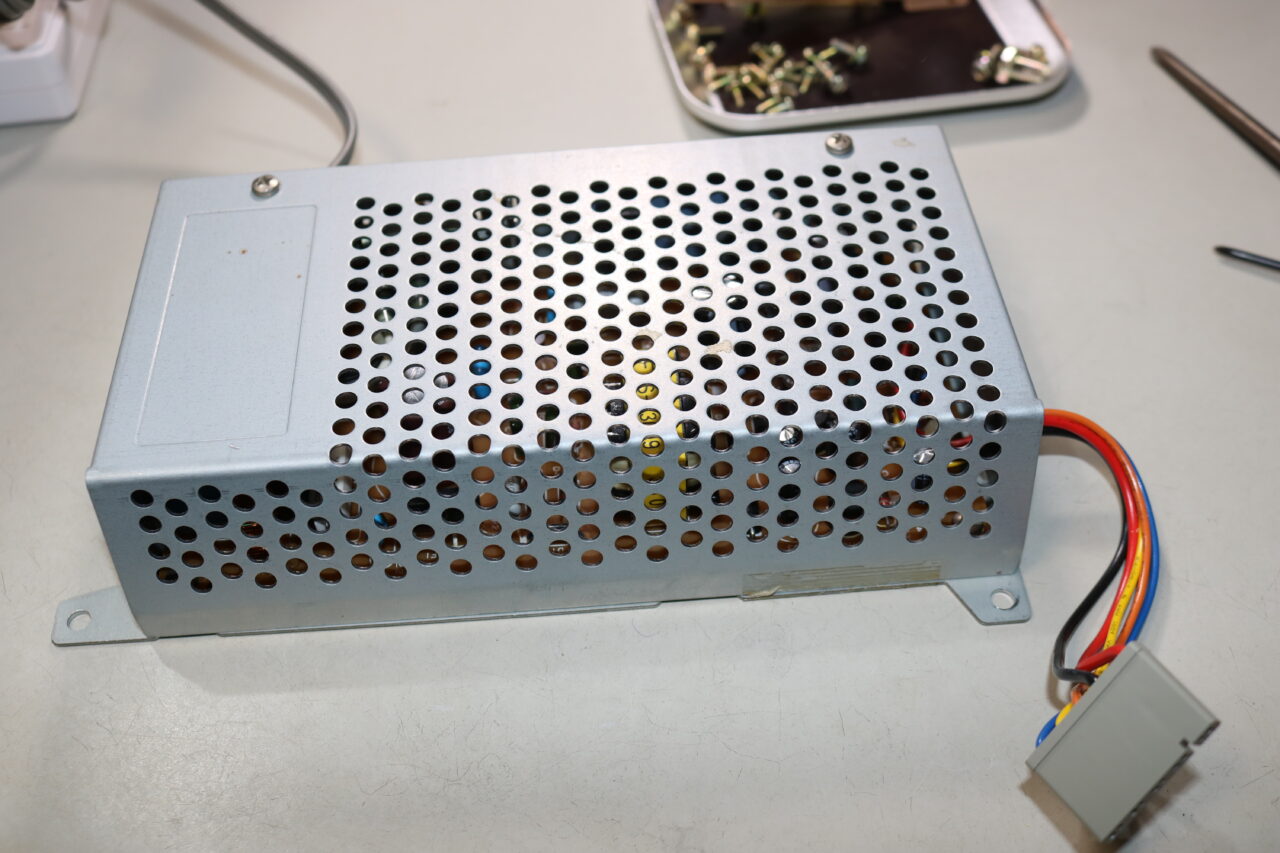 ▼取り外した電源ユニットのパンチ穴のついたカバーを外すと基盤が現れます。後の作業のために左下隅と右下隅のネジを外します。