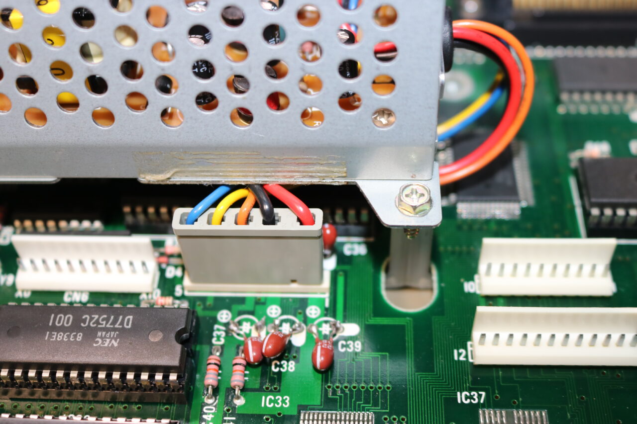 電源ユニットはメイン基板に写真のコネクタで接続されています。このコネクタ周りにあるタンタルコンデンサが経年劣化でショートをしてしまうと電源が入らなくなります。